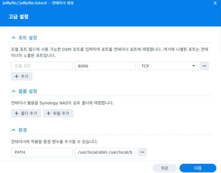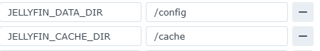6. 아래와 같이 지정해 두면, Jellyfin에서 /config폴더를 사용하는 폴더의 경우, 지정한 폴더를 사용하여 데이터를 저장하고 사용하게 된다.